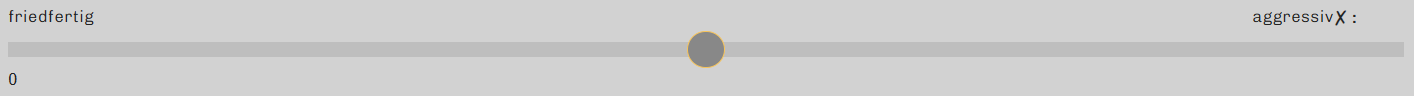 Auf der Skala des Eigenschaftenpaares friedfertig und aggressiv startet der Wert mit 0. Der Charakter ist also ebenso friedfertig wie aggressiv. Er befindet sich in der Mitte. Neigt der Charakter zu besonderer Friedfertigkeit, steht ihm die Negativskala von 0 bis -100 zur Verfügung. -100 entspricht hier extrem friedfertig. Neigt der Charakter stattdessen zu ausgeprägter Aggression, kann auf der Skala ein Wert zwischen 0 und +100 ausgewählt werden, wobei +100 für extrem aggressiv steht.