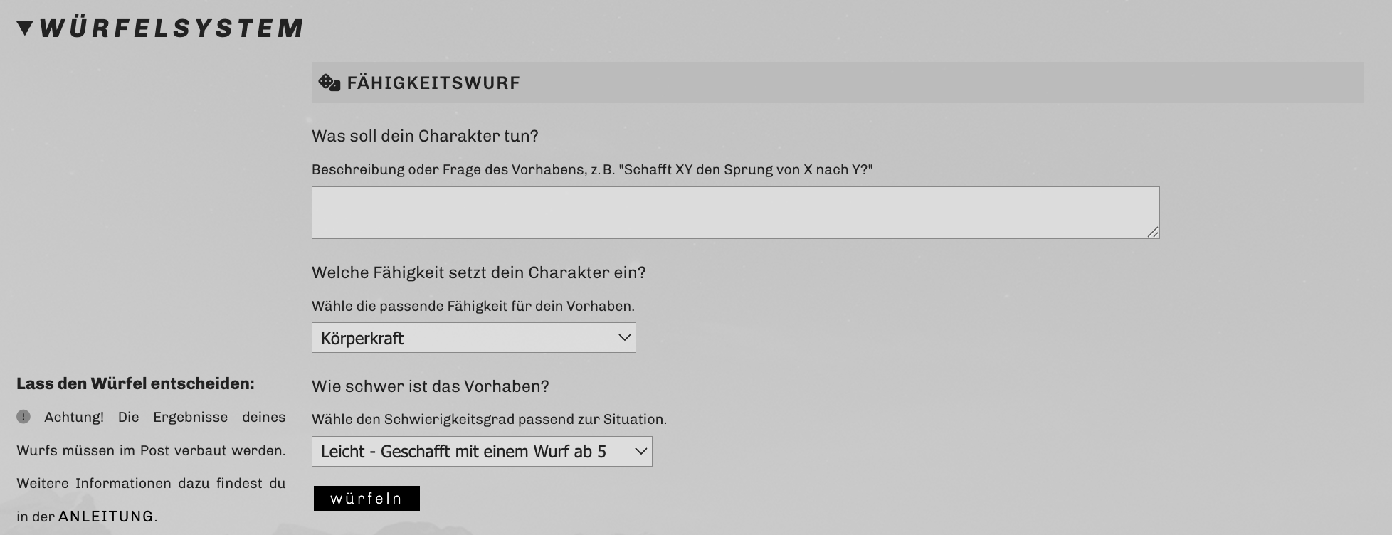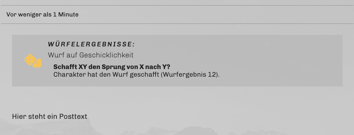 Das Ergebnis eures Wurfs wird euch nach dem Klicken auf den Würfel-Button direkt angezeigt, bleibt auch in der Postvorschau unten an der Stelle des Würfelsystems sichtbar und wird über eurem Post ausgegeben, nachdem er abgeschickt wurde. So können eure Postingpartner:innen sehen, was ihr erwürfelt habt.