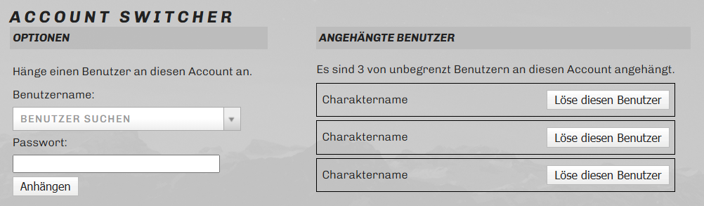 Unter Angehängte Benutzer könnt ihr eure verknüpften Accounts einsehen. Bei Bedarf könnt ihr hier auch Mehrcharaktere von eurem Hauptaccount lösen, um beispielsweise einen anderen Account als primären zu hinterlegen. |